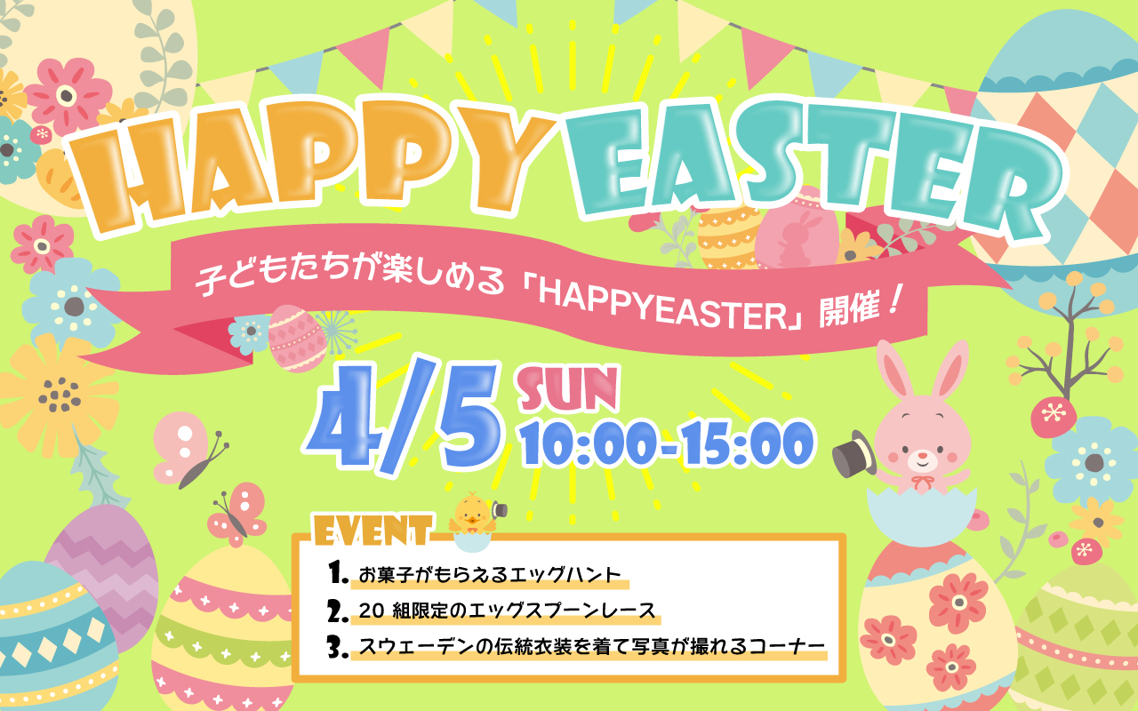 4/5(日)10:00-15:00子どもたちが楽しめる「HAPPYEASTER」を開催します! たまごを3 つ見つけると、お菓子がもらえるエッグハント! さらに、20 組限定のエッグスプーンレースも!※雨天時は内容変更や […]